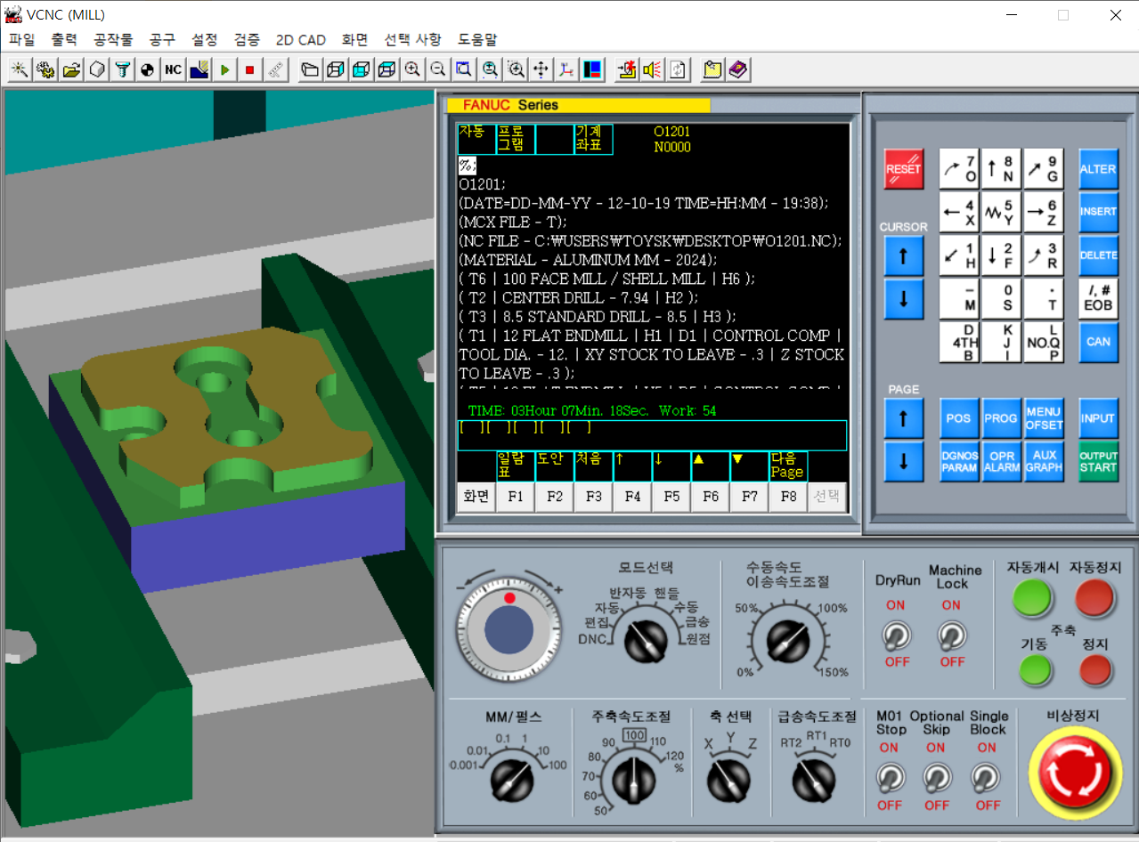 완성된, NC 프로그램은 V-CNC에서 모의 기계가공으로 실제가공 조건으로 모의가공 및 완성품 치수 검사(검증)으로 작업을 완료합니다.