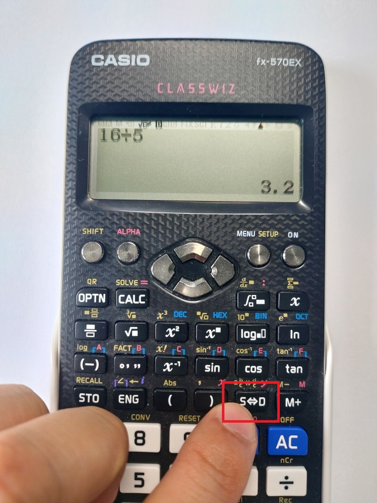 계산기 숫자 부분 바로 위에, 'S <=> D' 버튼이 있는데, 해당 버튼을 누르면 분수에서 정수로, 정수에서 분수로 각각 변환됩니다.