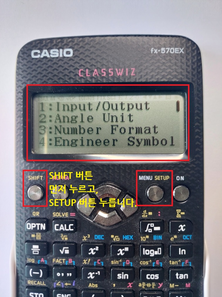 먼저, 계산기에서 SHIFT 버튼을 먼저 누르고, SETUP 버튼을 눌러, 위의 이미지처럼