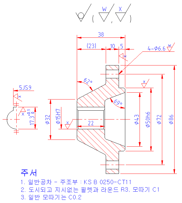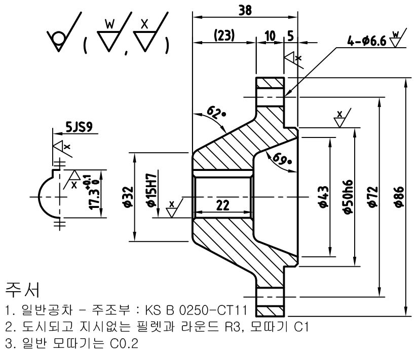 (3) 해칭, 치수, 일반공차 및 끼워맞춤공차, 표면거칠기, 주서 작성 방법에 대한 설명