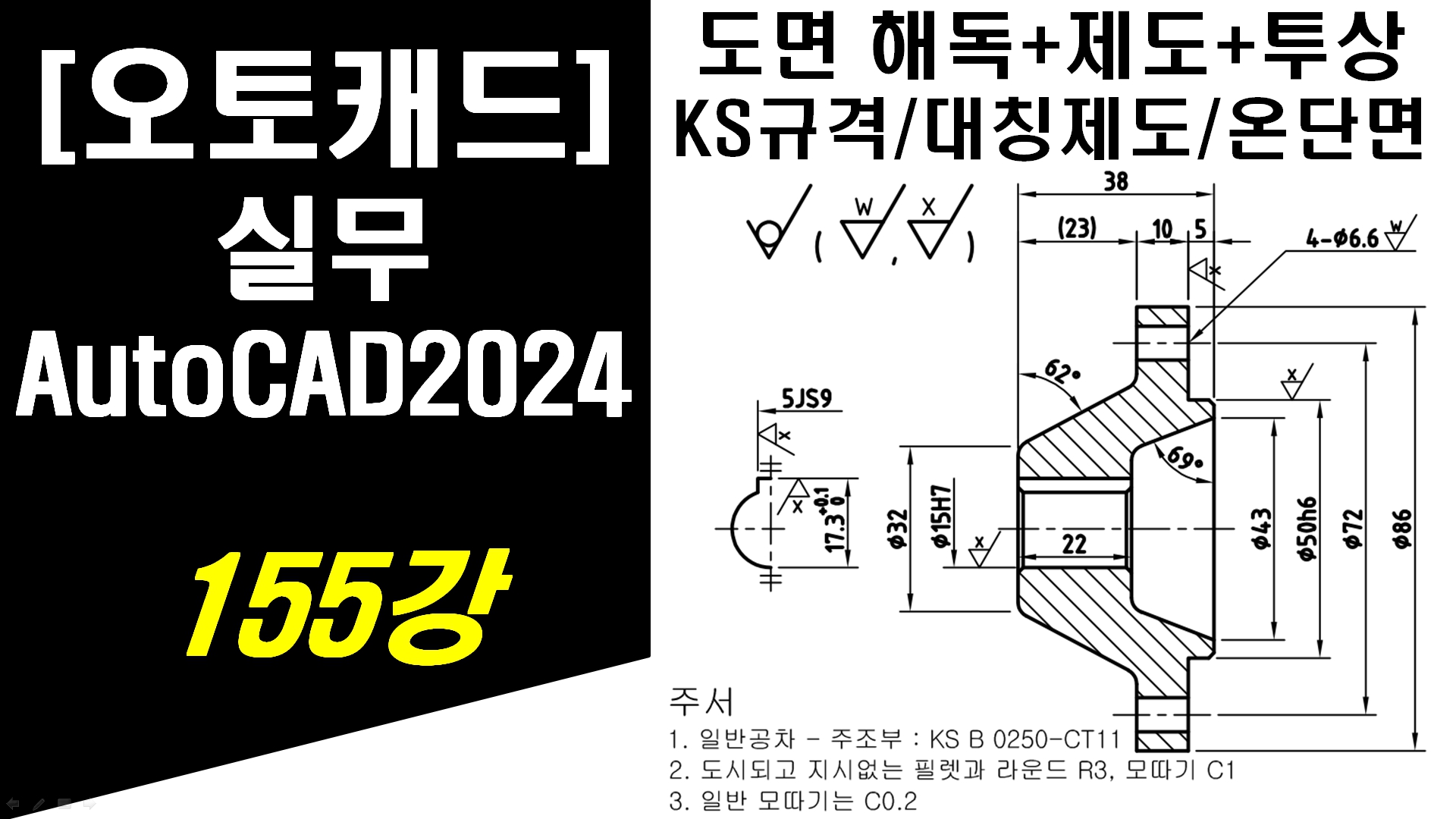[ 오토캐드 - 실무 ] 155강 동력전달 부품 커플링 도면해독 및 도면제도, 투상 방법 (KS규격 및 대칭제도, 온단면도, 볼트 구멍, 해칭, 치수, 공차, 표면거칠기, 주서)
